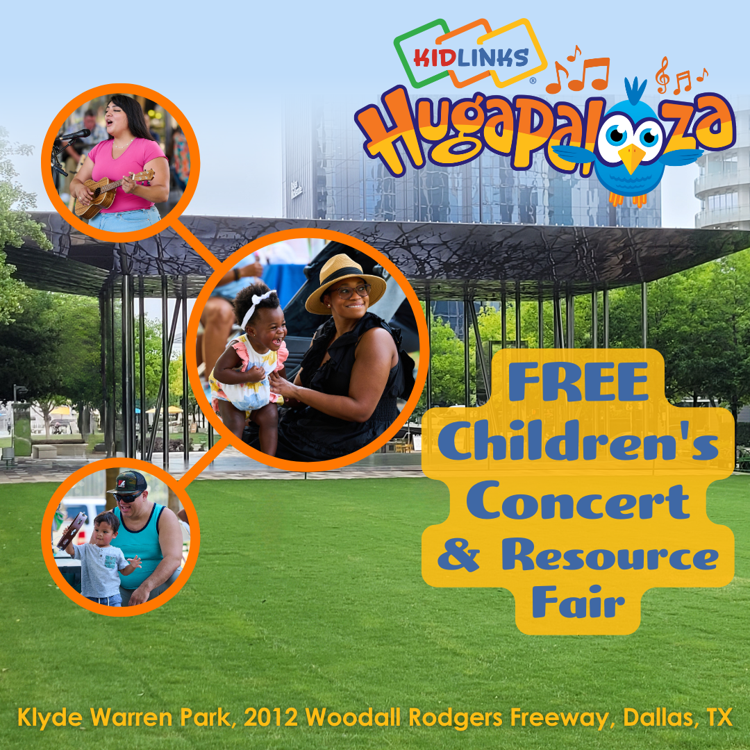 You're invited to Hugapalooza! This free, kid-centered sing-along concert and resource fair is put on by KidLinks as a way to say thank you to the community for supporting us. We are excited to return to the vibrant Klyde Warren Park in Dallas. Check back for specific date and details.