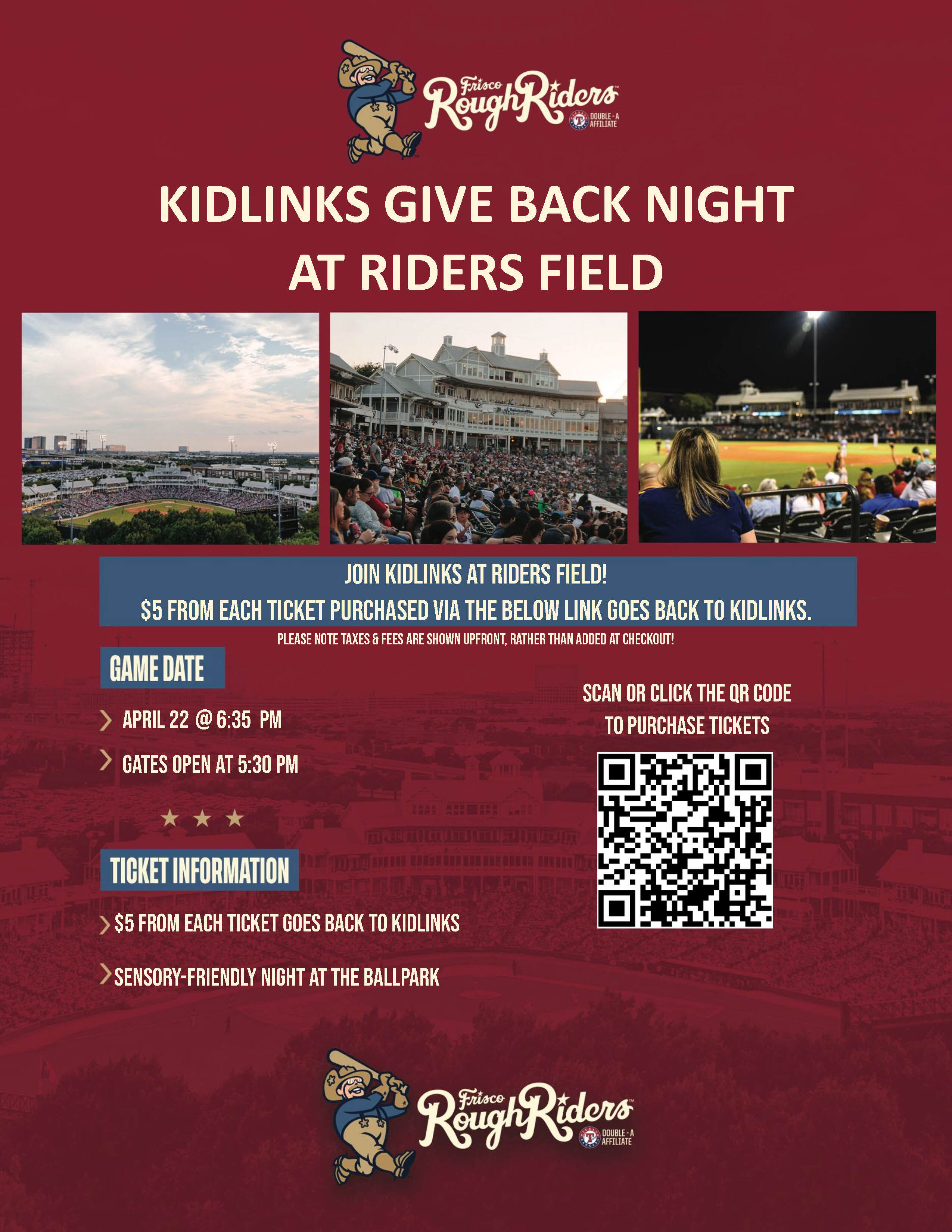 Join us at Riders Field in Frisco on April 22 for a night at the ballpark! $5 from each ticket sold goes back to KidLinks.
